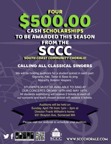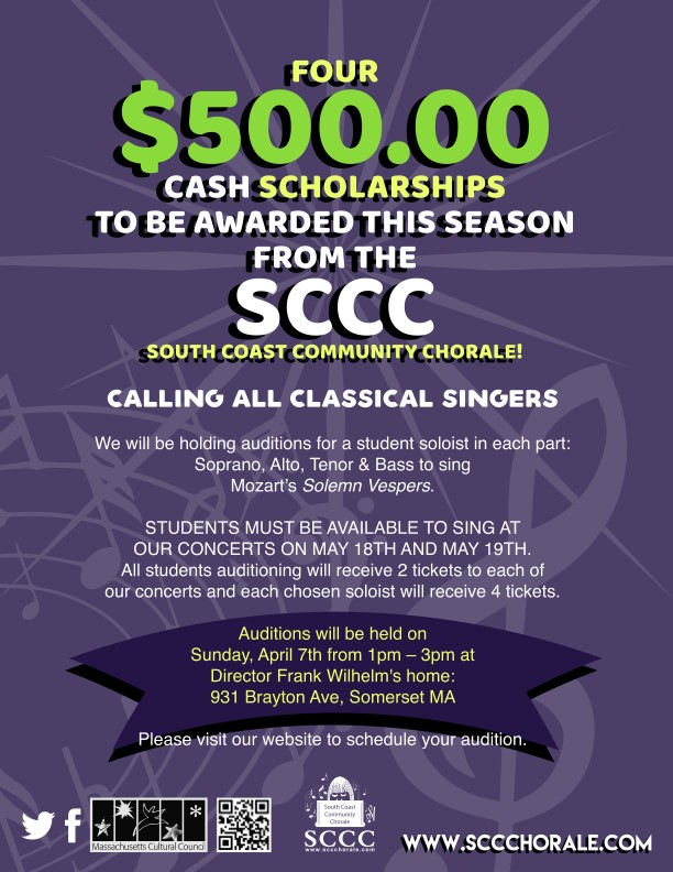 South Coast Community Chorale is looking for high school and undergraduate college students who love to sing classical music! We are auditioning soprano, alto, tenor, and bass soloists for Mozart’s Solemn Vespers and to sing in our concerts this spring. Each student who auditions will automatically receive 2 free tickets to 1 of our concerts on either May 18 or May 19th, 2019. If you are selected as a soloist you will receive 4 free tickets as well as a $500 cash Scholarship.