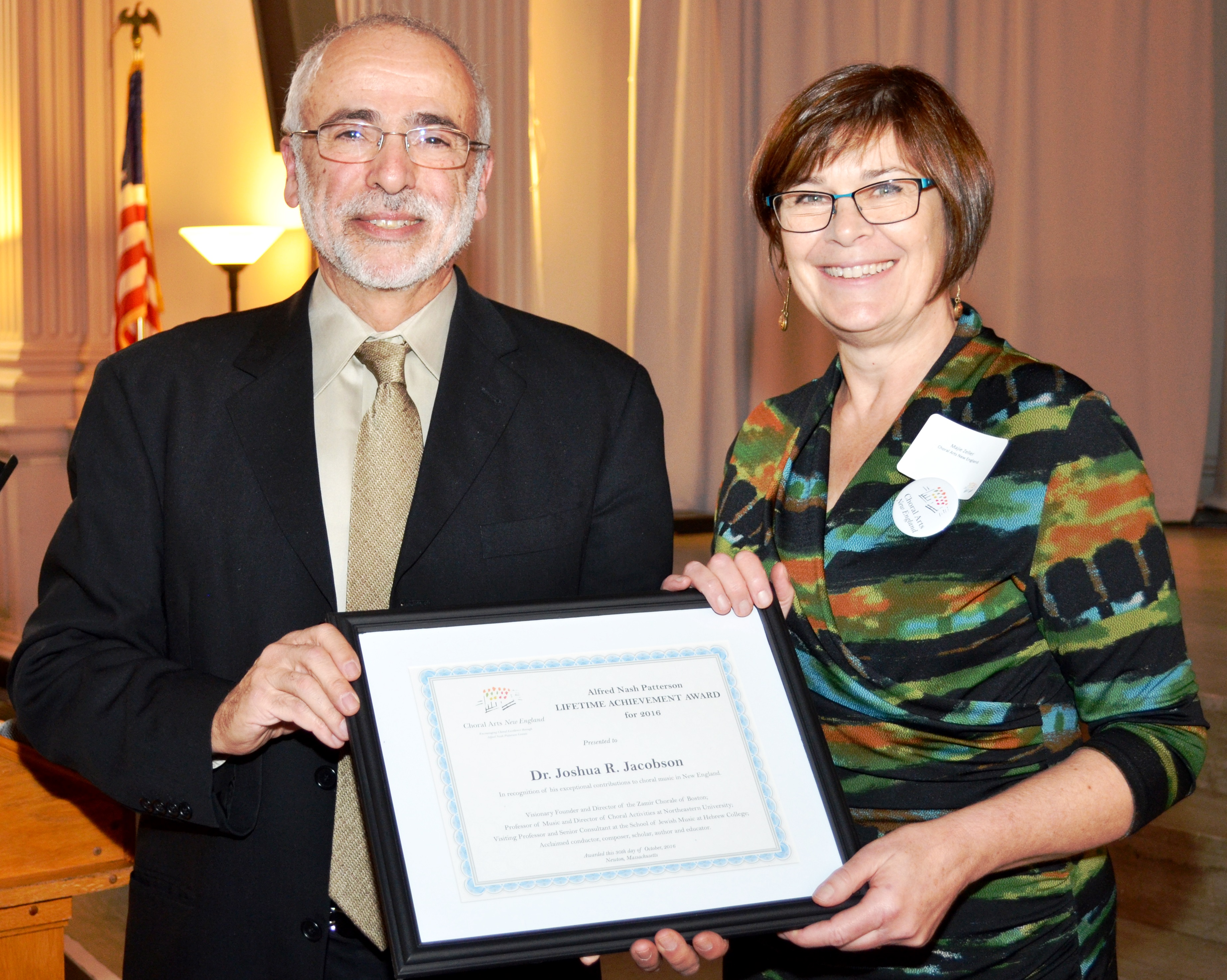 I should also thank my parents. Although they’re no longer with us, they would have shepped lots of nakhas today. They would have been very proud. They were both artists, and for some reason never objected when I told them I wanted to become a professional musician. I thank my wife Ronda for her unstinting support, her love (that’s the most important thing), and her acceptance of “I can’t tonight – I have a rehearsal.” And of course I owe a great debt to the thousands of singers who have sung under my direction, in Zamir, at Northeastern University and in the various festivals I’ve been privileged to guest conduct. I have learned more from you than from any textbook. You are my teachers.