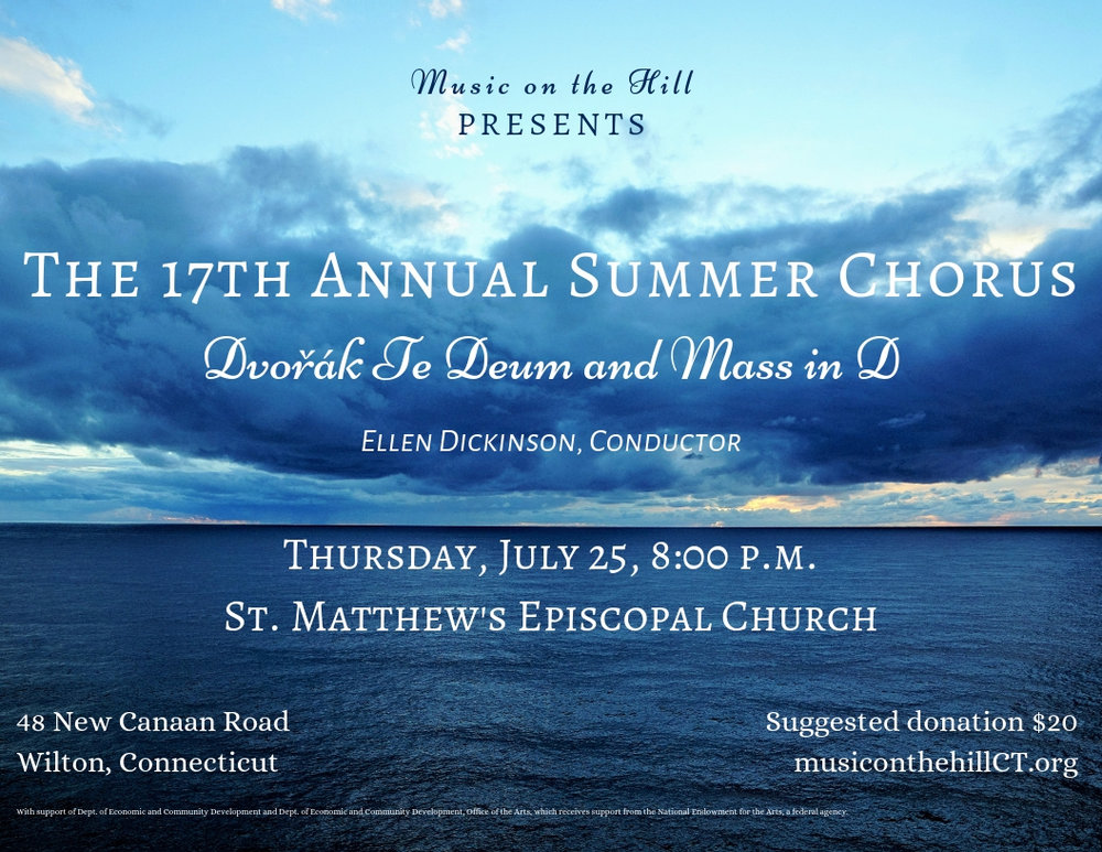 Music on the Hill’s Summer Chorus for its 17th season presents Dvorak's Te Deum & Mass in D, two works he wrote in the early 1890s in anticipation of moving to New York City. The chorus is 50+ volunteer singers from across the region who come together Tuesdays and Thursdays in July to prepare for a July 25 concert in Wilton, CT. No auditions required. It is a great way to sing along with fellow choristers in a relaxed and yet highly professional setting. To register contact Artistic Co-Director Ellen Dickinson at ellen@musiconthehillCT.org.