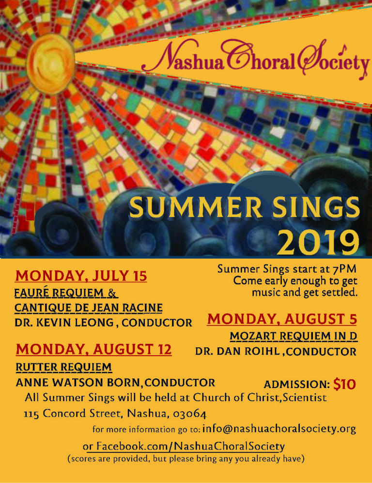 Summer Sings with the Nashua Choral Society. A fun evening to just sing! Monday evenings, beginning at 7 p.m.