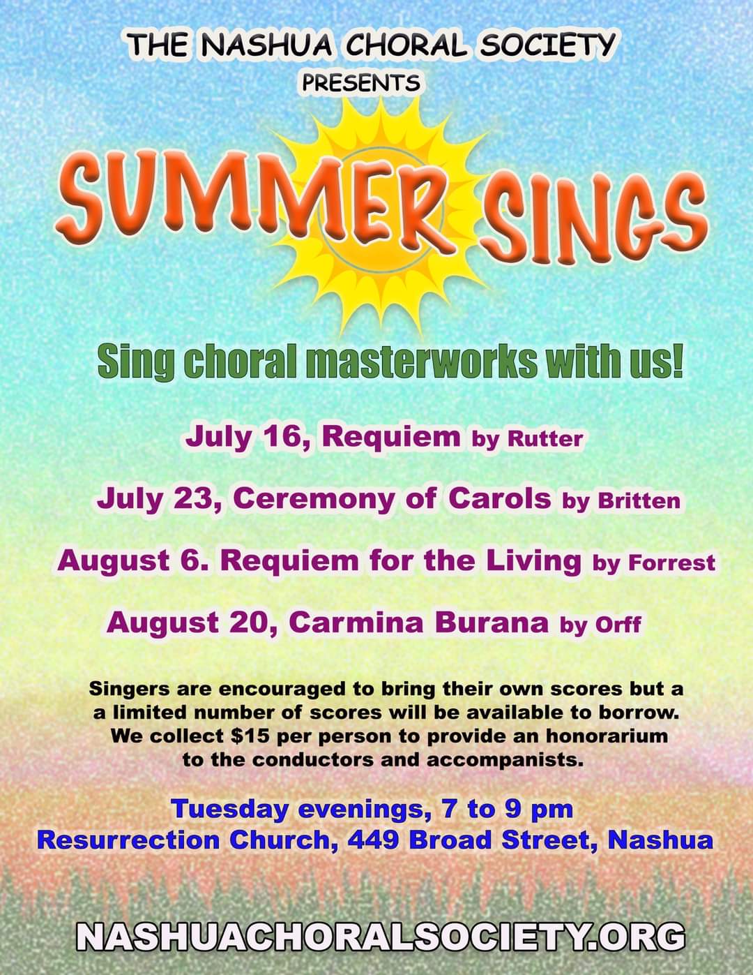 Sings are 7:00 - 9:00 PM at the Parish of the Resurrection, 449 Broad Street, Nashua, NH. Singers are encouraged to bring their own scores, but a number of scores will be available to borrow.